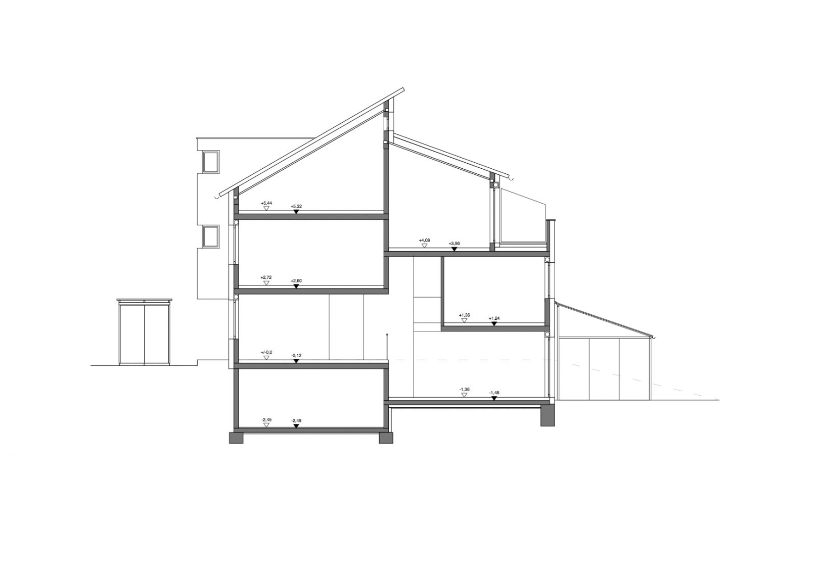 Die ca. 155,0 m2 großen Reihenhäuser stehen in zweiter Reihe auf einem sehr ruhigen, idyllischen Bauplatz mit tollem Blick in die begrünte Nachbarschaft. Durch die Anlehnung an das natürliche Gelände entstand eine spannende innere Aufteilung mit viel Licht und offener Grundrissgestaltung. Auf drei Ebenen (plus Kellergeschoss) verteilen sich die sechs Zimmer, zwei Bäder und ein offener Arbeitsbereich. Durch die sinnvolle Anordnung der Zimmer und die Wahl geeigneter Zimmergrößen entstanden viele individuelle Möglichkeiten. Die Bewohner haben vollste Flexibilität bei der Nutzung der einzelnen Wohnräume.